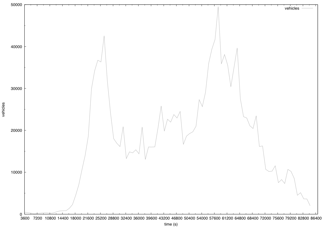 下图显示了 24 小时周期内需求数据的结构。这显示了出行的正常行为。高峰时段如上午 8-9 点、下午 4-6 点,出行次数通常很高。科隆市的更多信息可在此链接中找到:[1]。24 小时内(由汽车完成的)总行程数非常接近注册汽车数量*3(每辆注册汽车 3 次行程)。大约有 ~420415*3 (~120 万) 次行程,这与图中的数字相符。