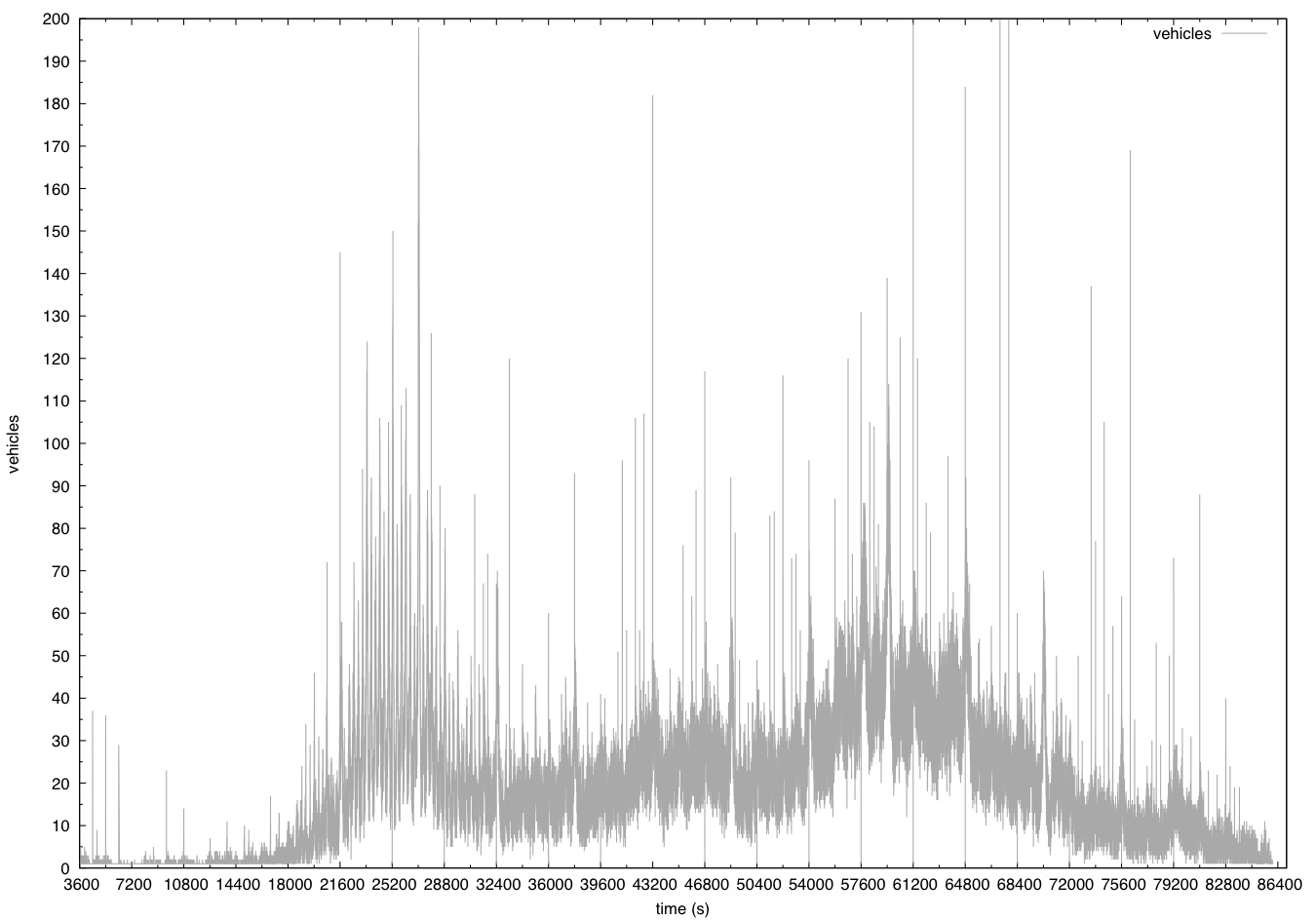 由于上述模拟网络的问题,场景附带的配置文件使用了 --scale 0.3 选项。这将需求减少到实际值的 30%,以避免全网交通拥堵。