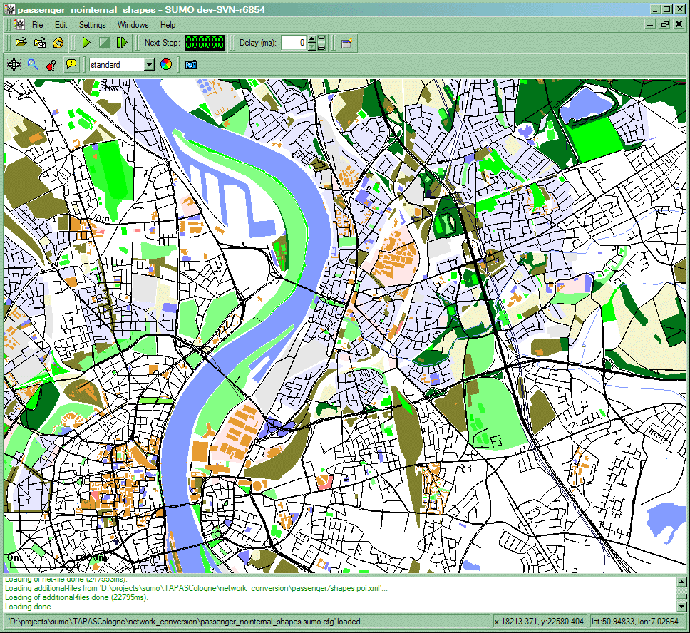 "TAPAS Cologne" 模拟场景描述了科隆市(德国)全天的交通状况。原始需求数据来自 TAPAS 系统,该系统根据德国人的出行习惯信息及其居住地的基础设施信息,计算区域内人口的出行需求。关于该系统的更多信息可在此处找到:关于 TAPAS 的出版物。原始数据使用的是闭源道路网络,并已映射到 OpenStreetMap 项目 的网络上。
