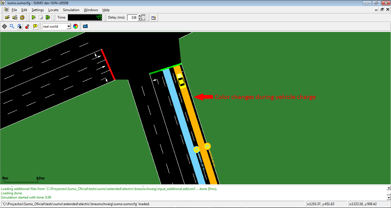 自 0.24.0 版本起,SUMO 包含了电动汽车模型。该模型由 TU-Braunschweig 的 Tamás Kurczveil 和 Pablo Álvarez López 实现。模型的核心实现在车辆设备 device.battery 中。其他功能包括充电站(可放置在网络中的任何车道上)和新的输出选项 --battery-output <FILE>。