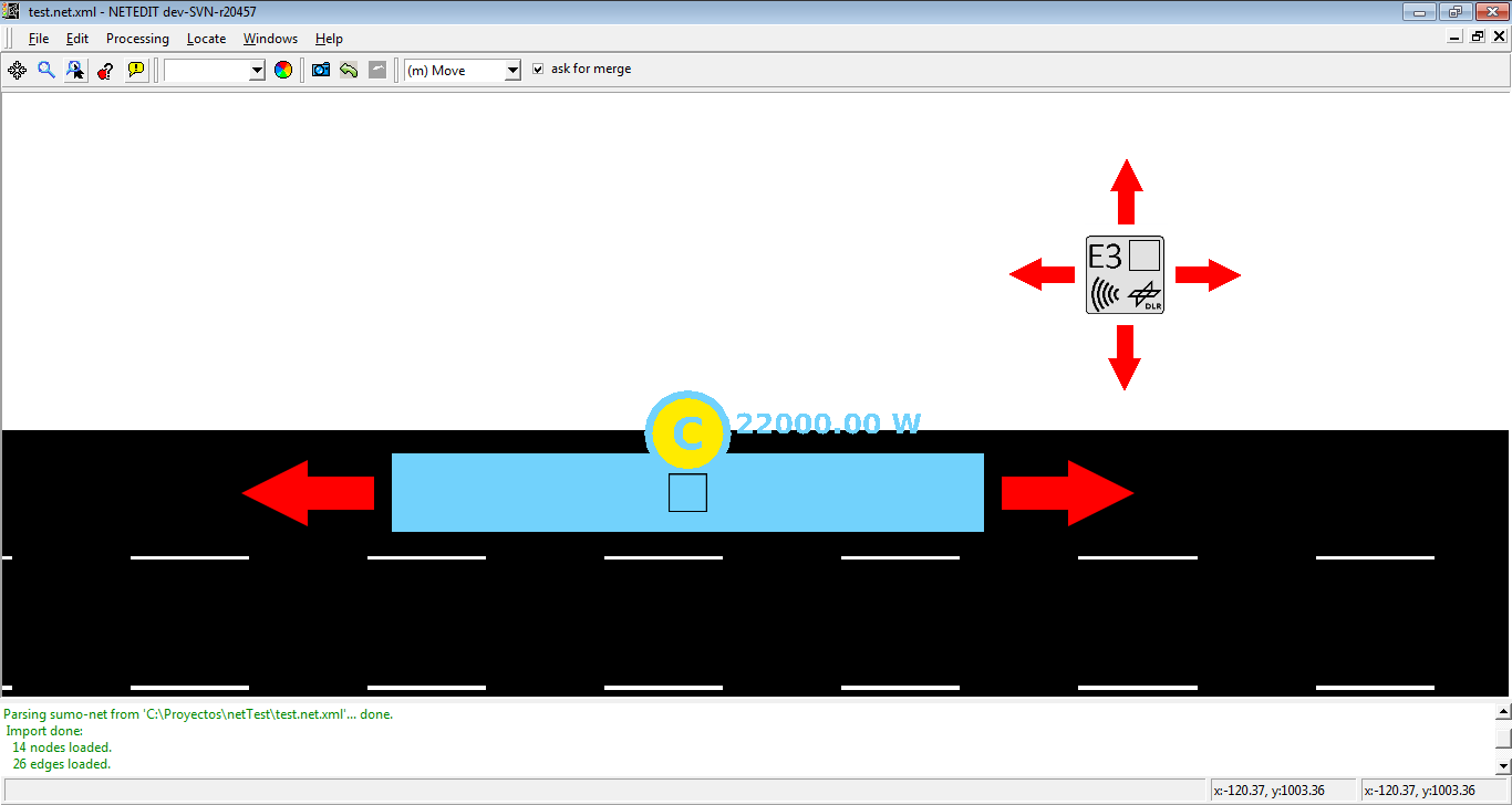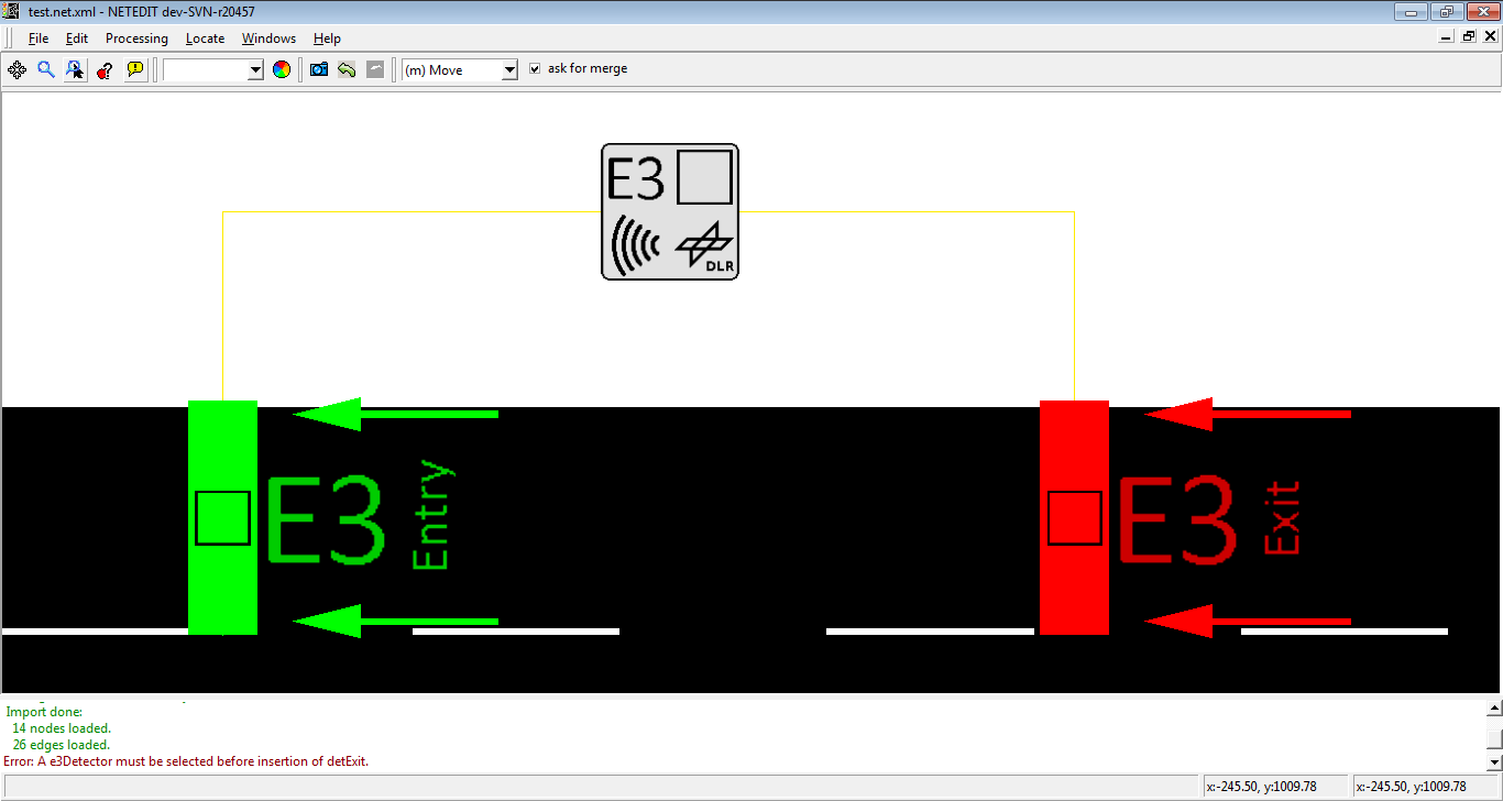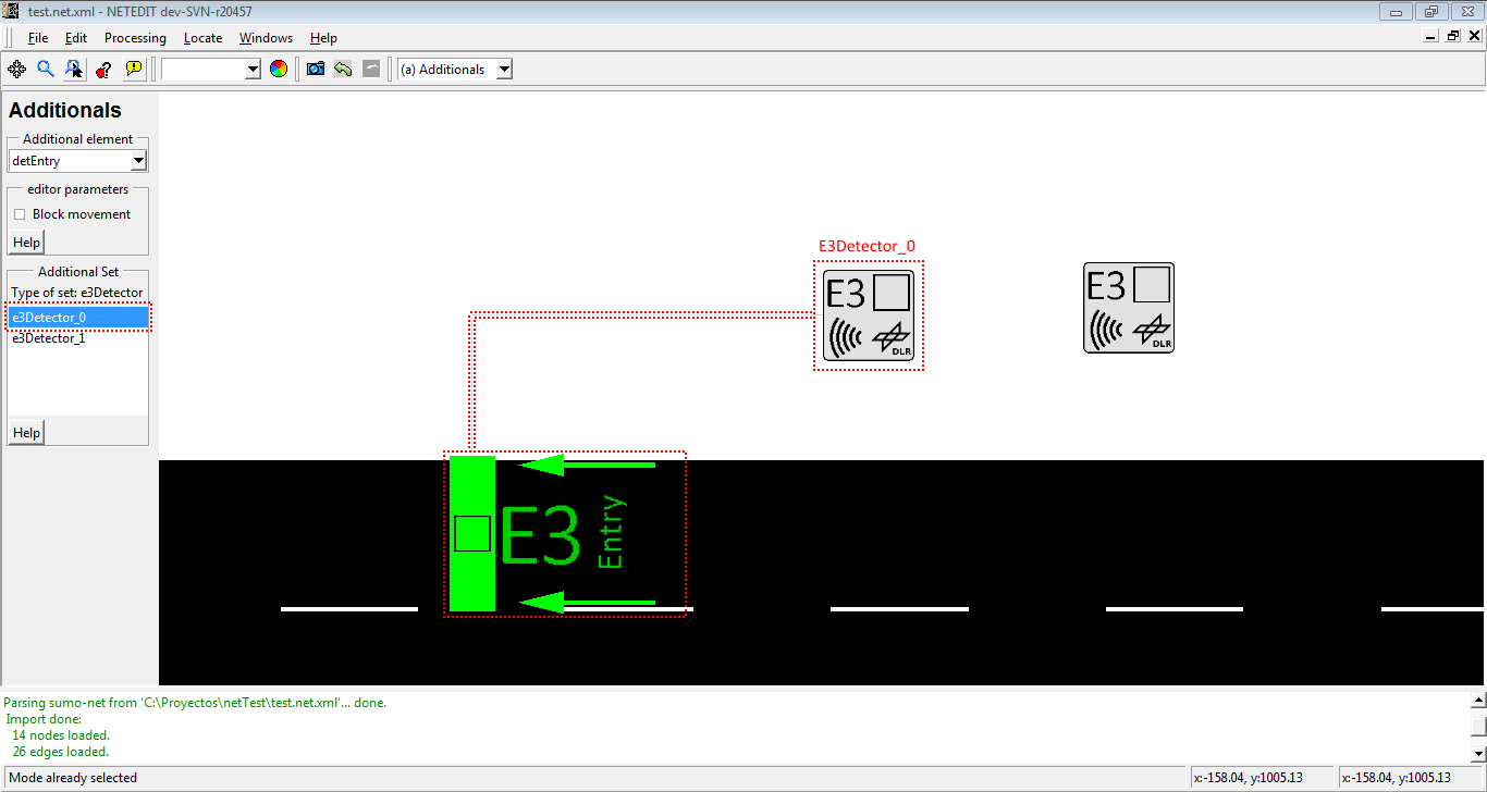 某些附加元素需要网络中已放置的另一个前置附加元素才能创建(例如,detEntry 或 detExit 需要前置的 detectorE3 已放置在网络中)。这些子附加元素的插入方式与附加元素相同,但子附加元素的插入方式不同。在地图中插入 子附加元素 之前,必须在左侧框架的ID列表中选择 父附加元素 的ID,或者在视图中点击父附加元素。在列表中,父附加元素的ID仅在它们可以作为子附加元素的父元素时才会出现(参考上述示例:如果用户想插入 detEntry,则左侧框架的列表中只会显示 detectorE3 的ID)。父附加元素及其子元素通过黄线图形化连接。