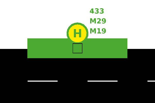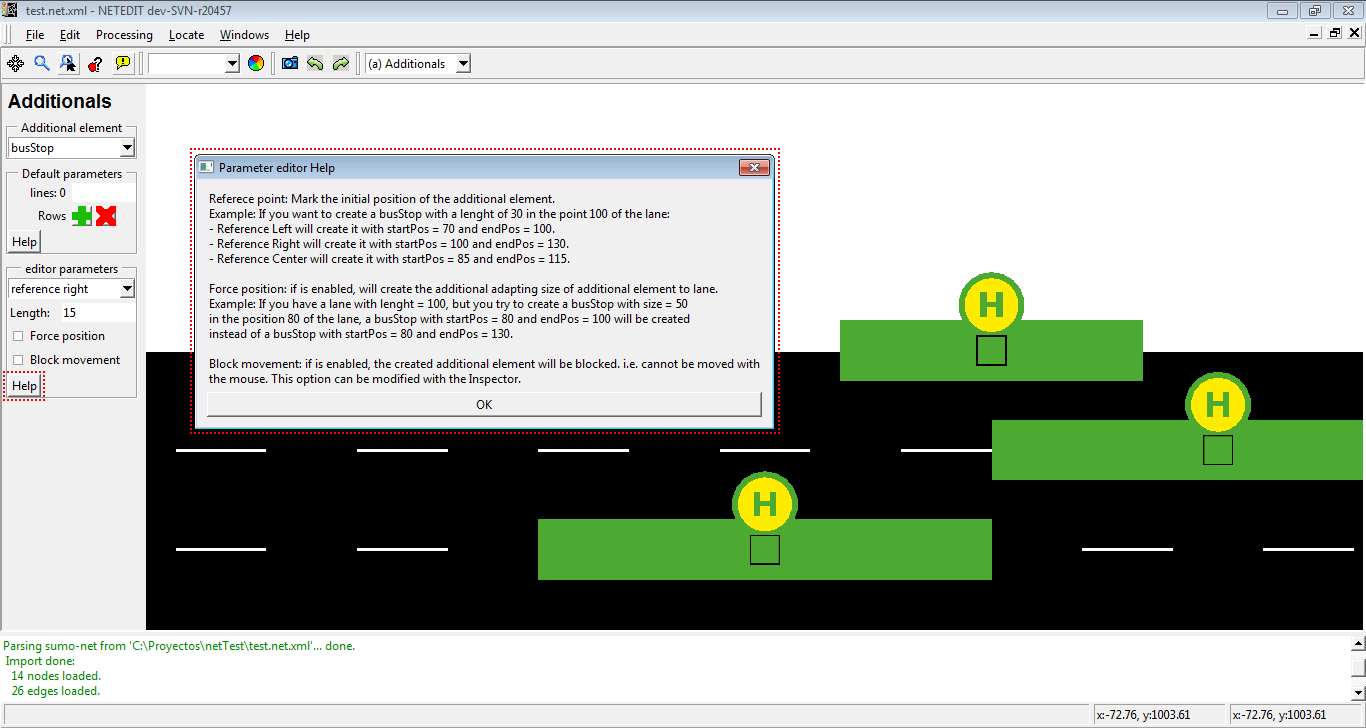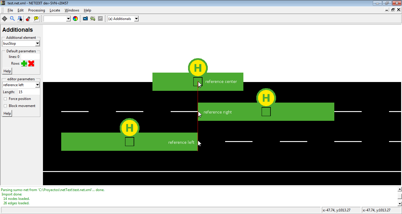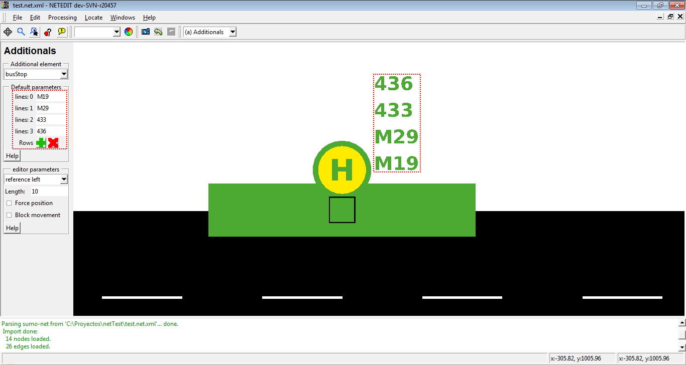 公交车站是车道上的位置,车辆(“公交车”)在此处停留预设的时间。每个公交车站都有一个由 netedit 自动分配的唯一ID、一个长度和一个由用户定义的公交线路列表。