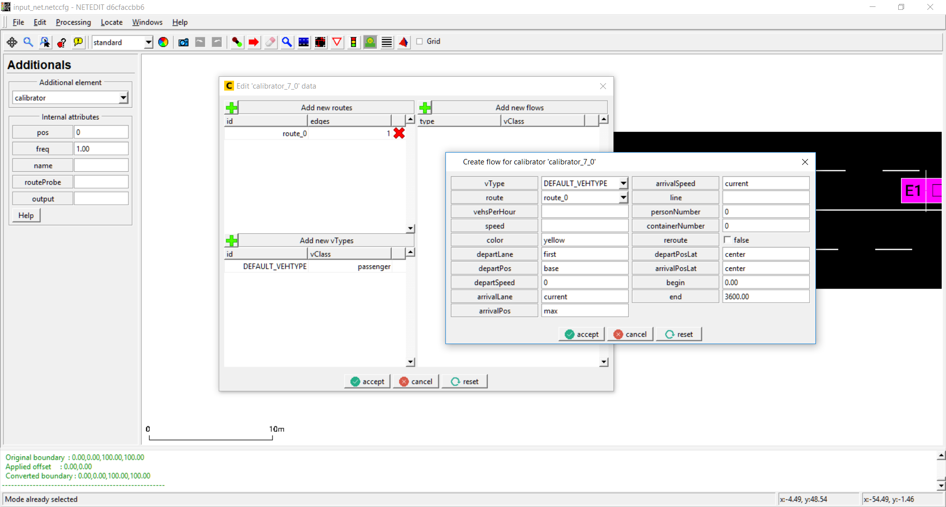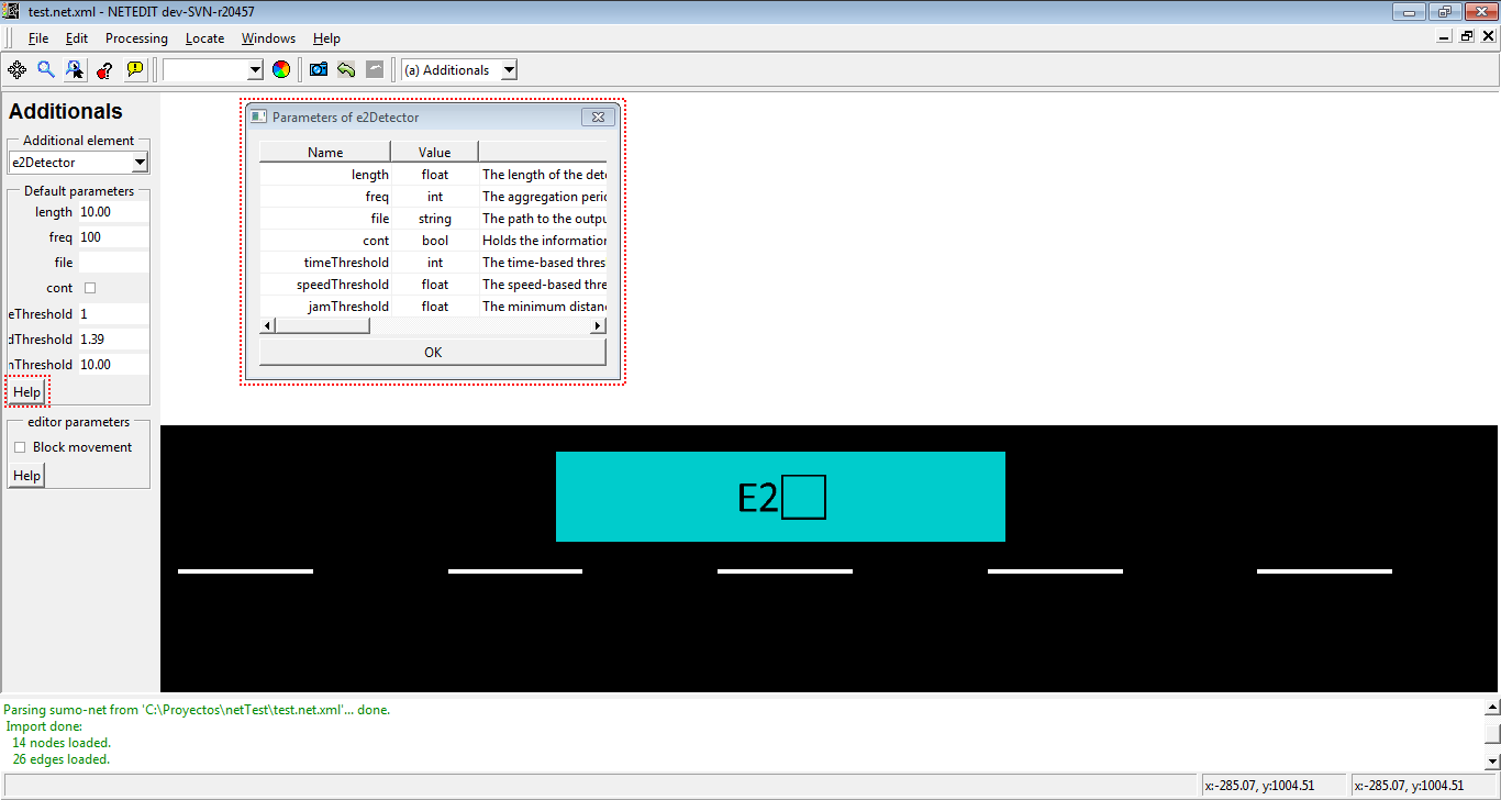 E1 检测器 拥有由 netedit 生成的ID参数、特定车道上的位置、freq 属性(描述收集值的聚合周期)、将被检测的 VTypes 列表,以及 file 属性(告诉仿真将结果写入哪个文件)。