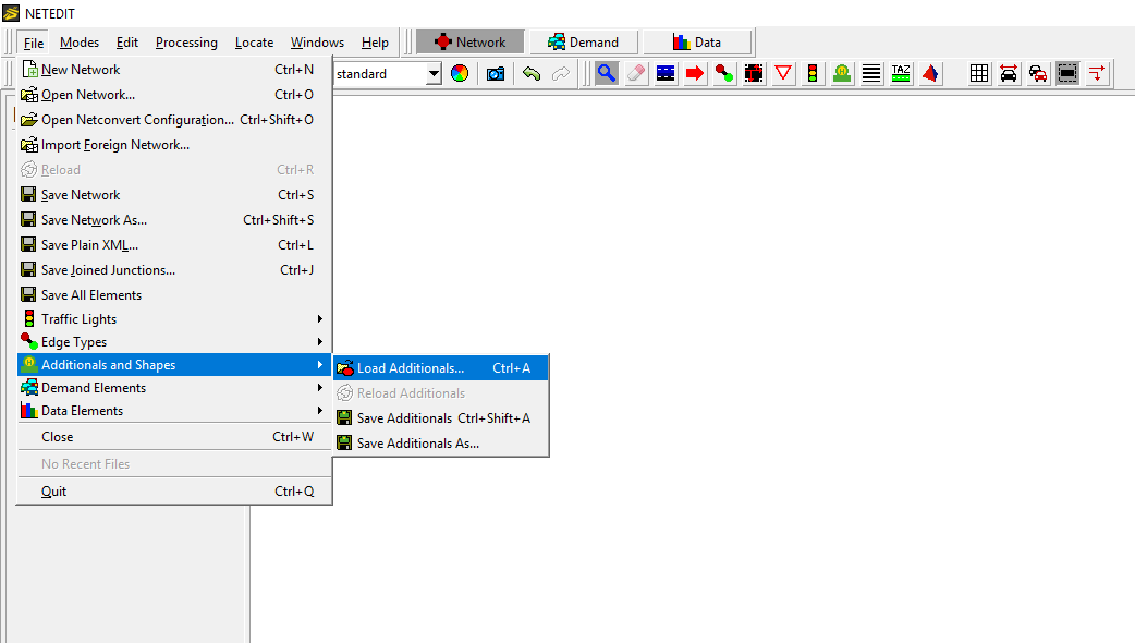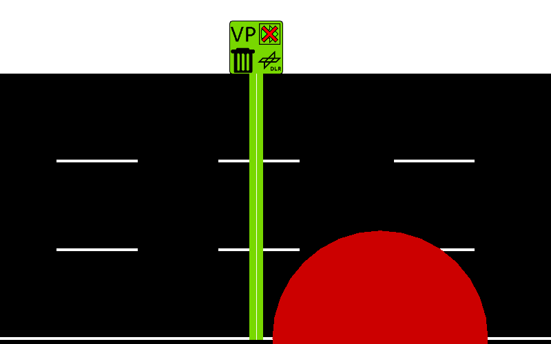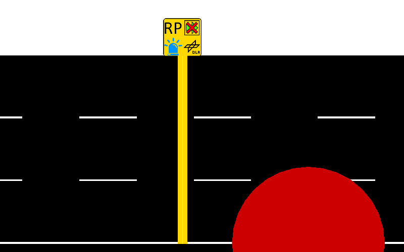 附加元素在 附加元素 编辑模式下创建(快捷键:a)。选择该模式后,首先需要在“附加元素类型”下拉框中选择要创建的附加元素类型。选择后,如果需要,可以更改附加元素的参数。最后,点击车道/路口/边缘(如果附加元素应设置在路网元素上)或空白区域(如果项目独立于路网),附加元素即被创建。