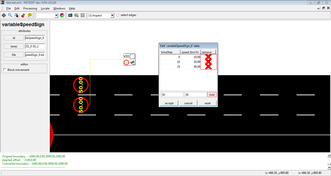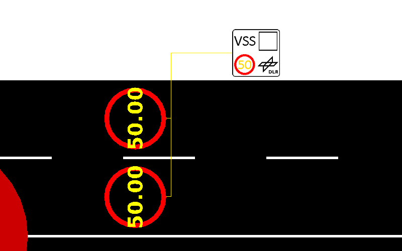 可变限速标志 (Variable Speed Signal) 在用户定义的特定时间内修改一组车道的速度。右键单击可变限速标志图标允许使用菜单选项“打开 variableSpeedSign 对话框”来打开值编辑器。