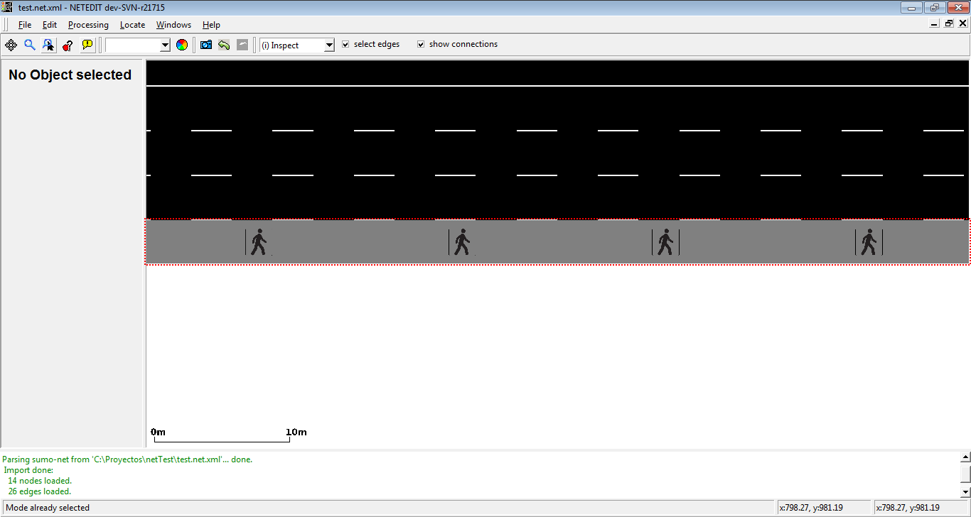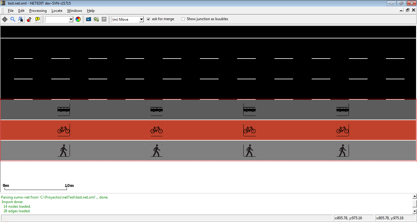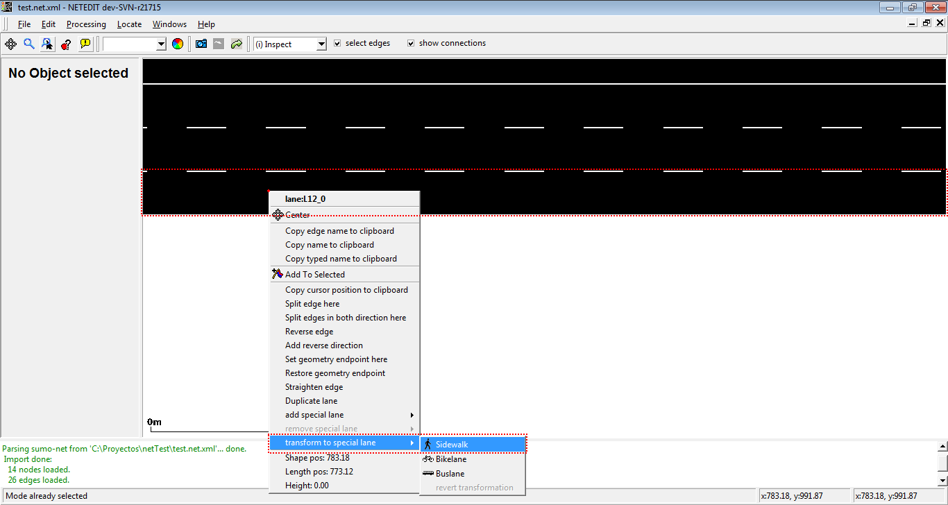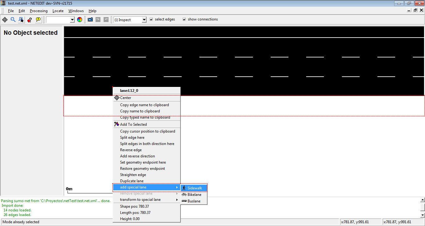 专用车道(针对特定车辆类别 VClass)可以在检查模式下轻松添加。目前 netedit 支持人行道(仅允许 VClass="pedestrian" 的车辆)、自行车道(仅允许 VClass="bike" 的车辆)和公交车道(仅允许 VClass="bus" 的车辆)。请注意,每条边只允许有一种类型的专用车道(例如,一条边可以拥有两条专用车道,一条供公交车使用,另一条供自行车使用,但不能有两条或更多不同的公交车专用车道)。