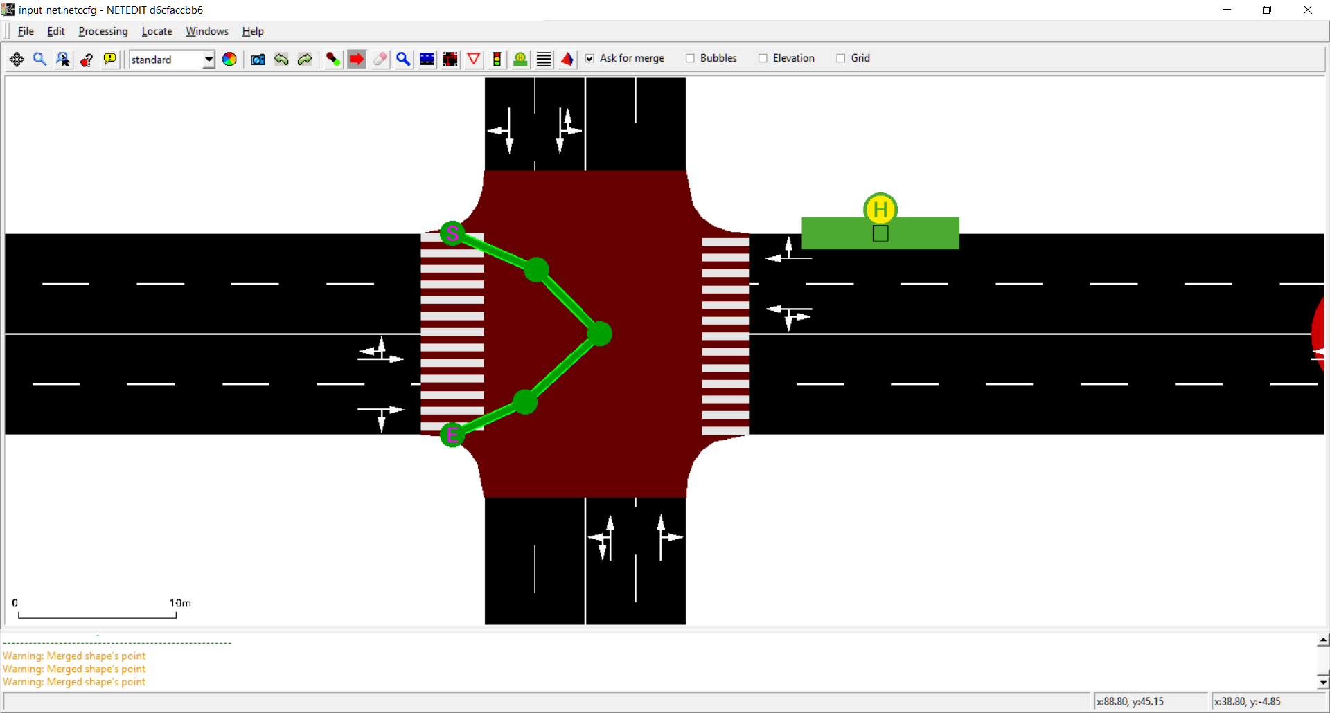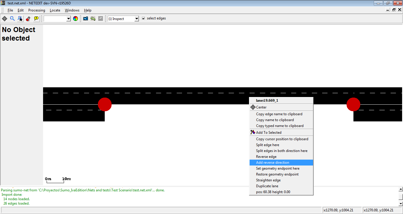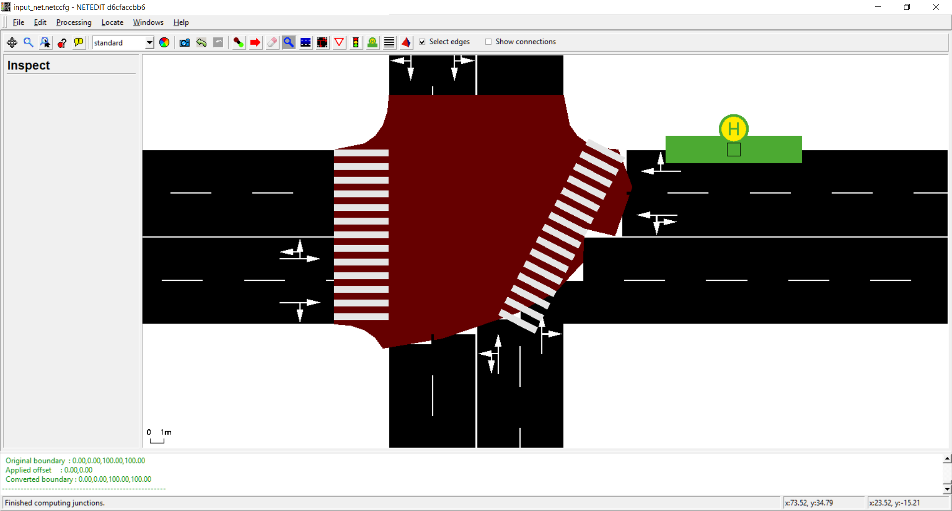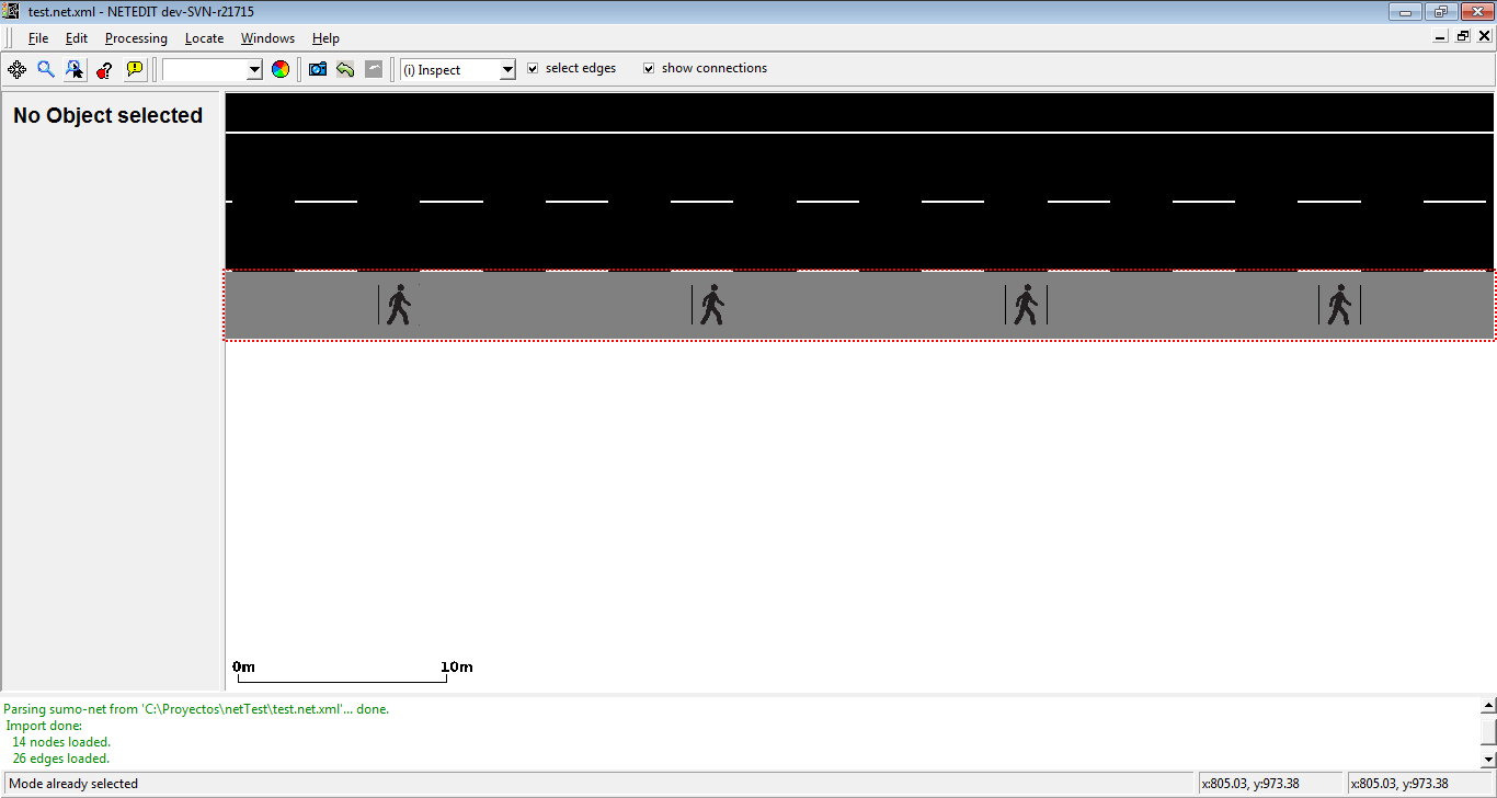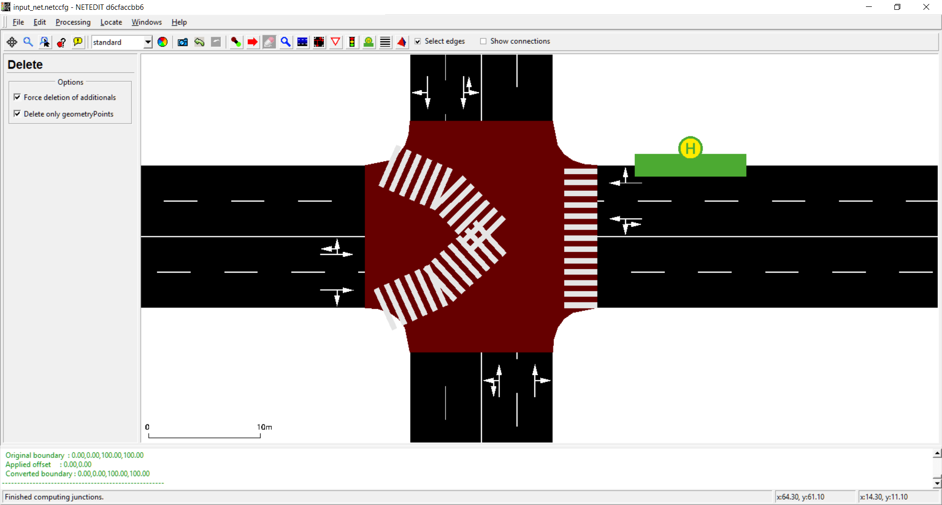 专用车道(针对特定车辆类别 VClass)可以在检查模式下轻松添加。目前 netedit 支持人行道(仅允许 VClass="pedestrian" 的车辆)、自行车道(仅允许 VClass="bike" 的车辆)和公交车道(仅允许 VClass="bus" 的车辆)。请注意,每条边只允许有一种类型的专用车道(例如,一条边可以拥有两条专用车道,一条供公交车使用,另一条供自行车使用,但不能有两条或更多不同的公交车专用车道)。