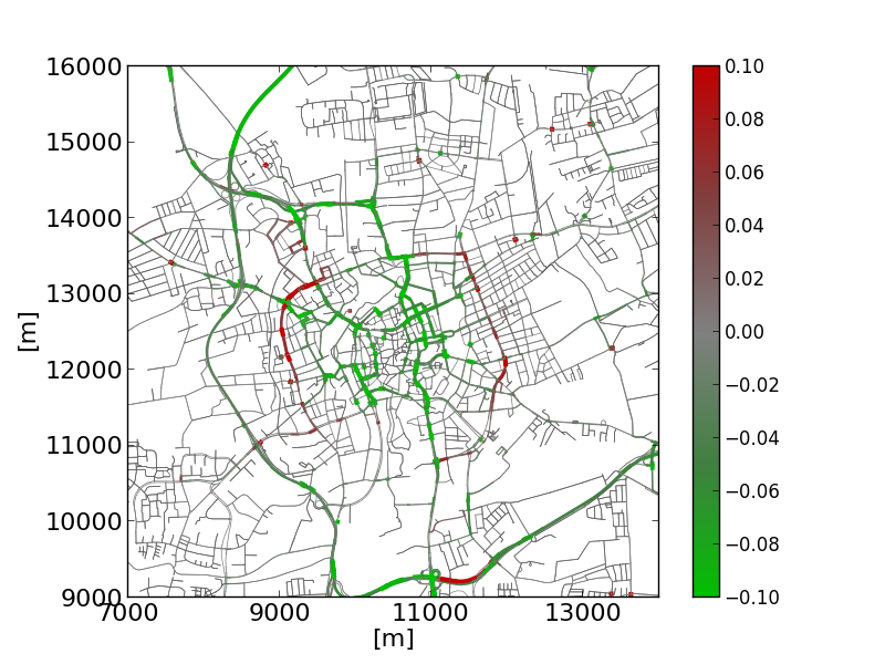 读取一个网络(使用 --net-file <NET> 或 -n <NET> 定义)和一个边 dump 文件(--dump <DUMPFILE> 或 -d <DUMP_FILE>)。使用从 <NET> 读取的几何形状绘制网络。每条边使用的宽度和颜色都使用 --value <WIDTHVALUE>,<COLORVALUE> 确定,其中 <WIDTHVALUE> 和 <COLORVALUE> 都是 dump 文件中存在的、每条边都有的属性。