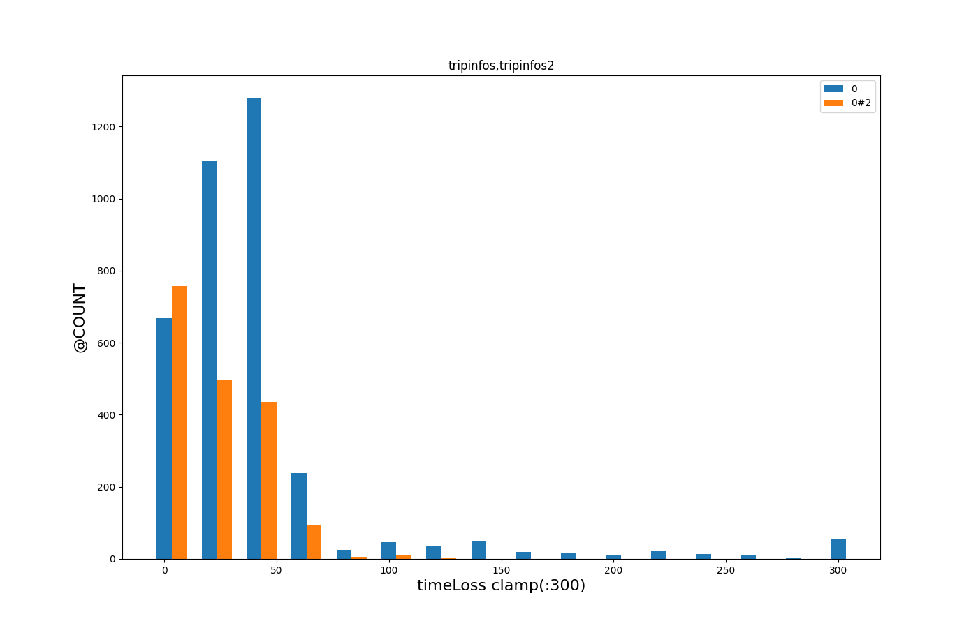读取两个 tripinfos 文件(强制选项 --tripinfos1 <FILE> 和 --tripinfos2 <FILE>,或简写 -1 <FILE> 和 -2 <FILE>)。提取由 --value 描述的值(默认值: duration)。绘制 tripinfos2 的值与 tripinfos1 的相应(相同车辆)值的关系图。