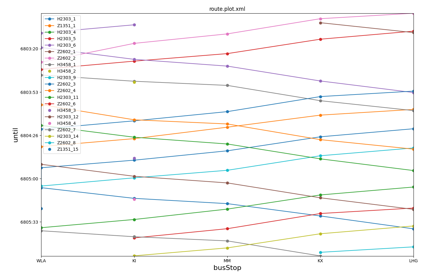 在此类图中,时间在 y 轴上,从上到下运行。输入是公共交通时刻表的路线文件,其中每辆车都是单独建模的。
