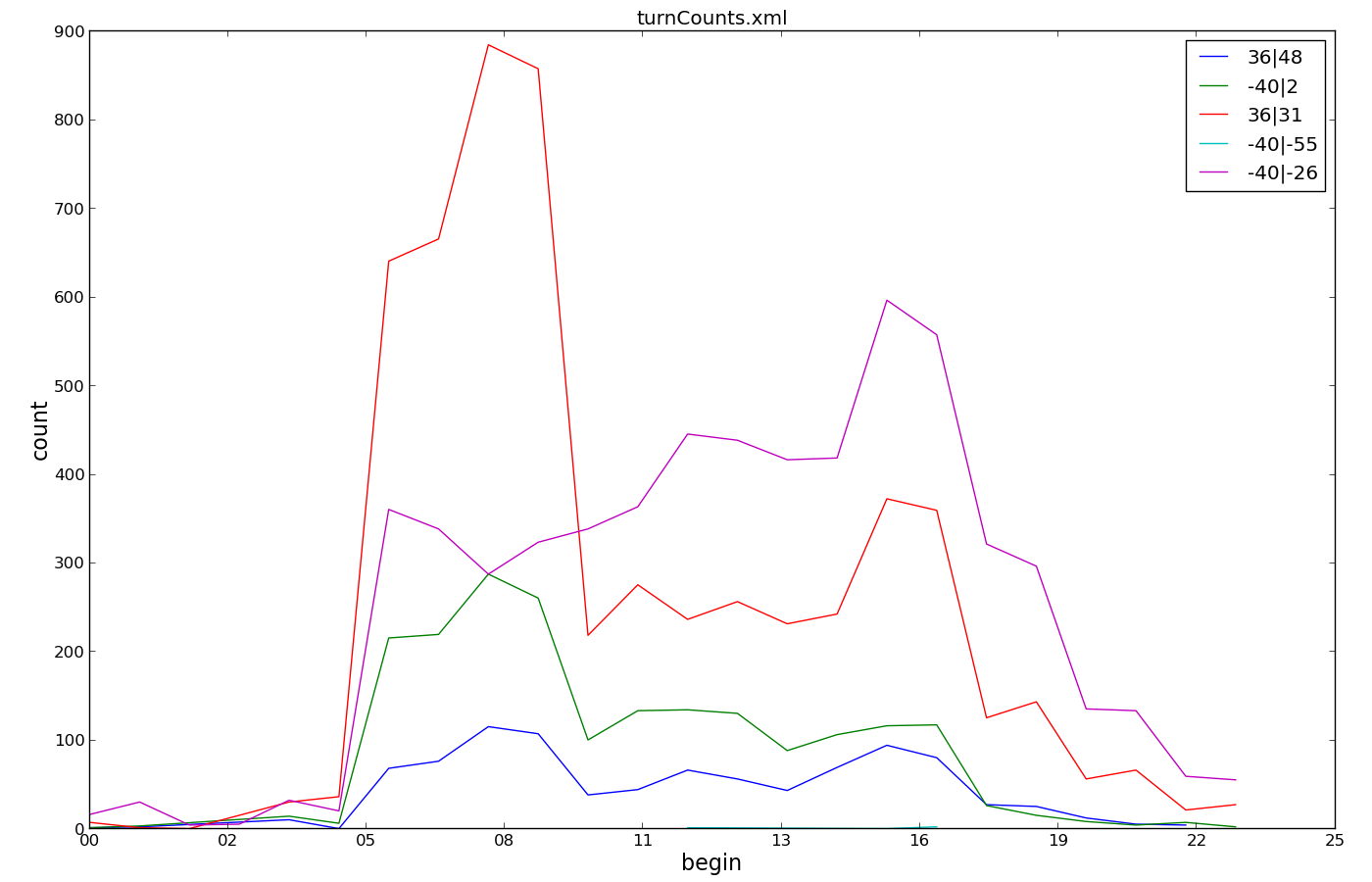 每种颜色代表不同的 edge-id。选项 --factor 60 用于将车辆/60 秒(edgeData-period 60)转换为车辆/小时。