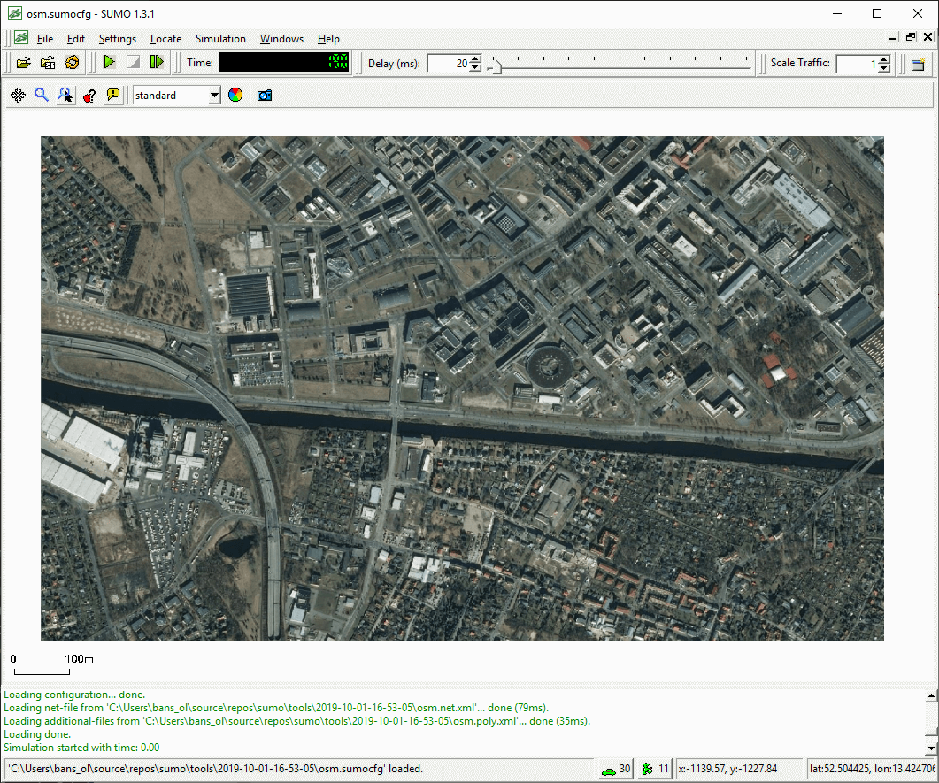 ),您应该能够加载现有的 sumo 配置文件,如果它具有正确的扩展名 ".sumocfg"。如果 sumo 配置文件 有错误,会报告错误,否则配置文件中引用的网络应该会显示出来。现在您可以按下 "播放" 按钮 (